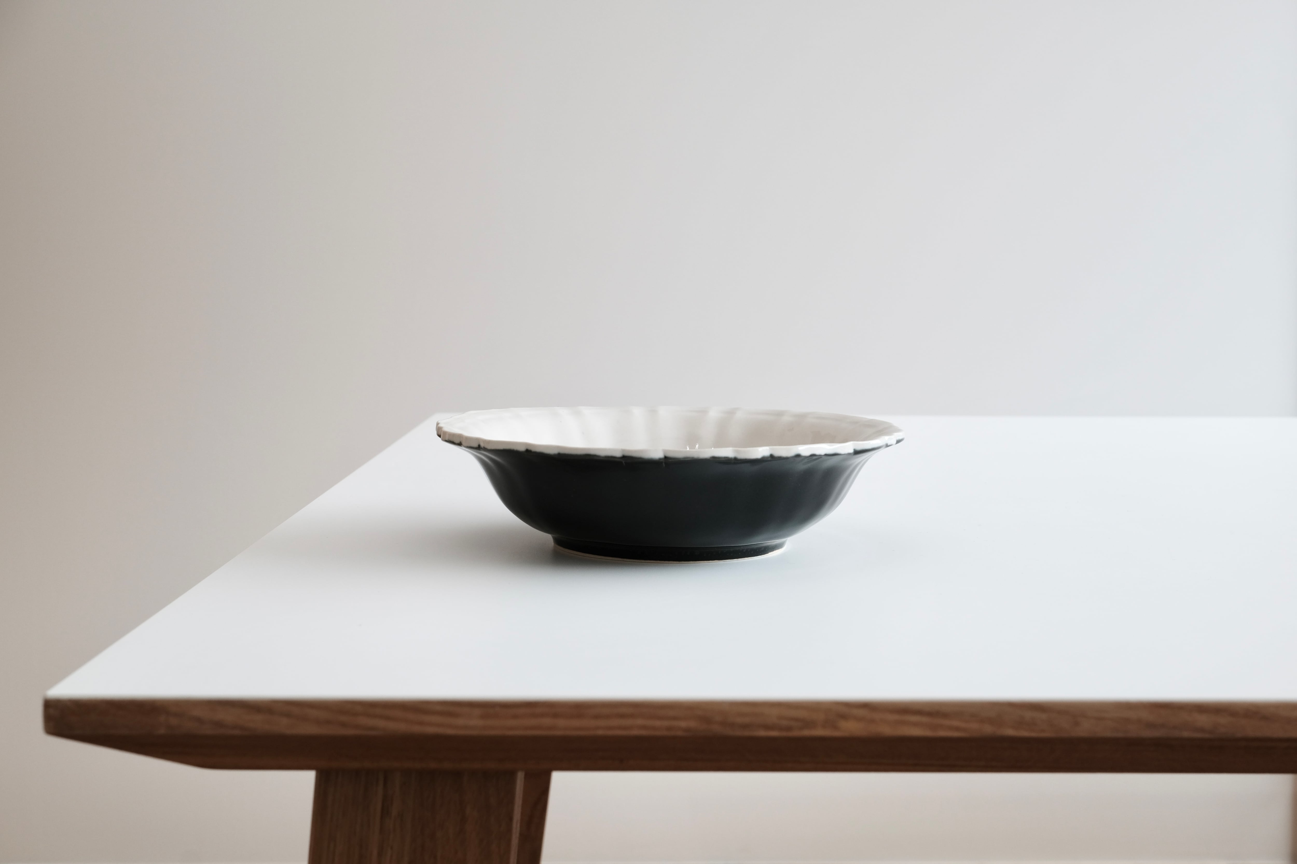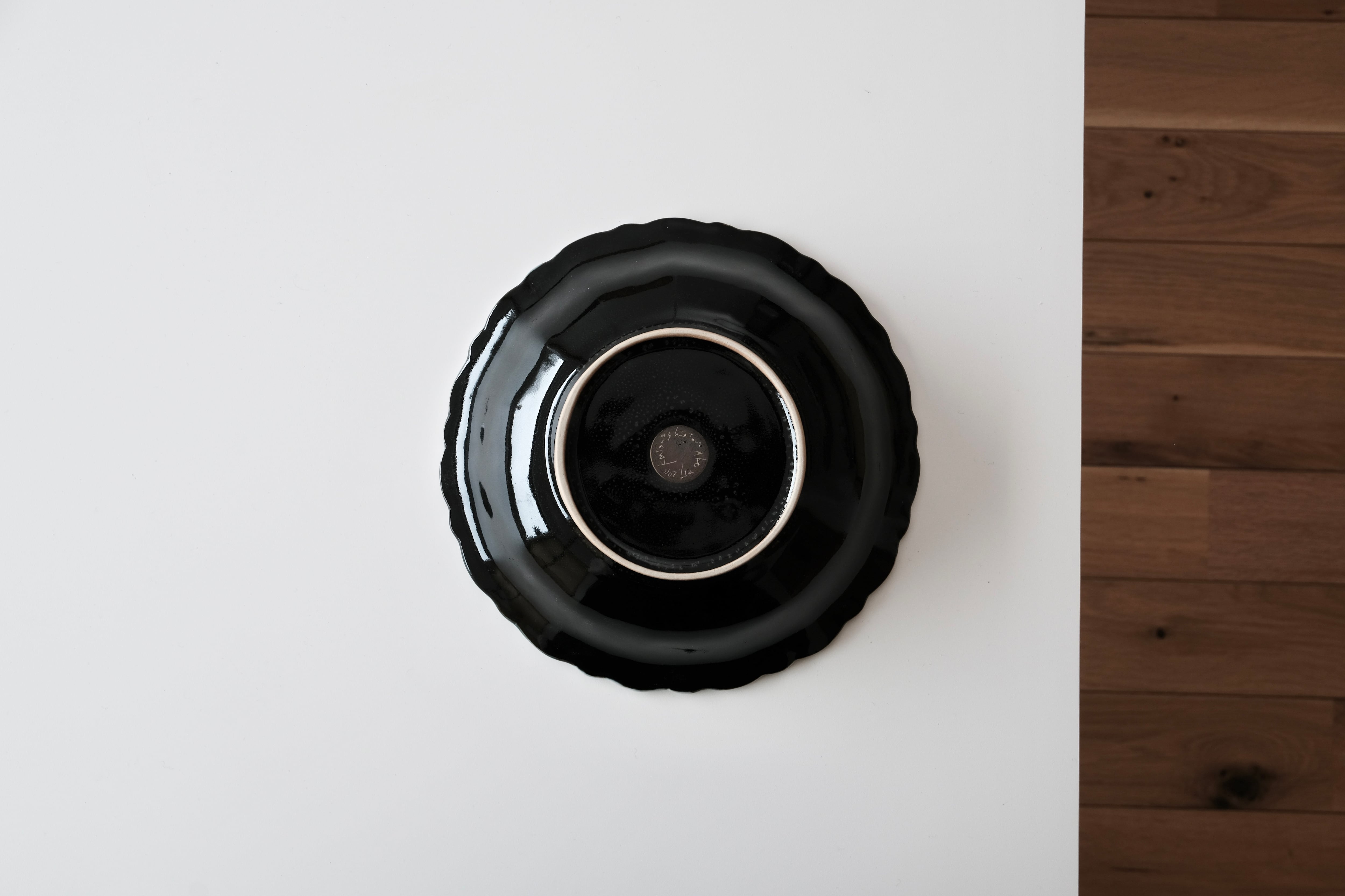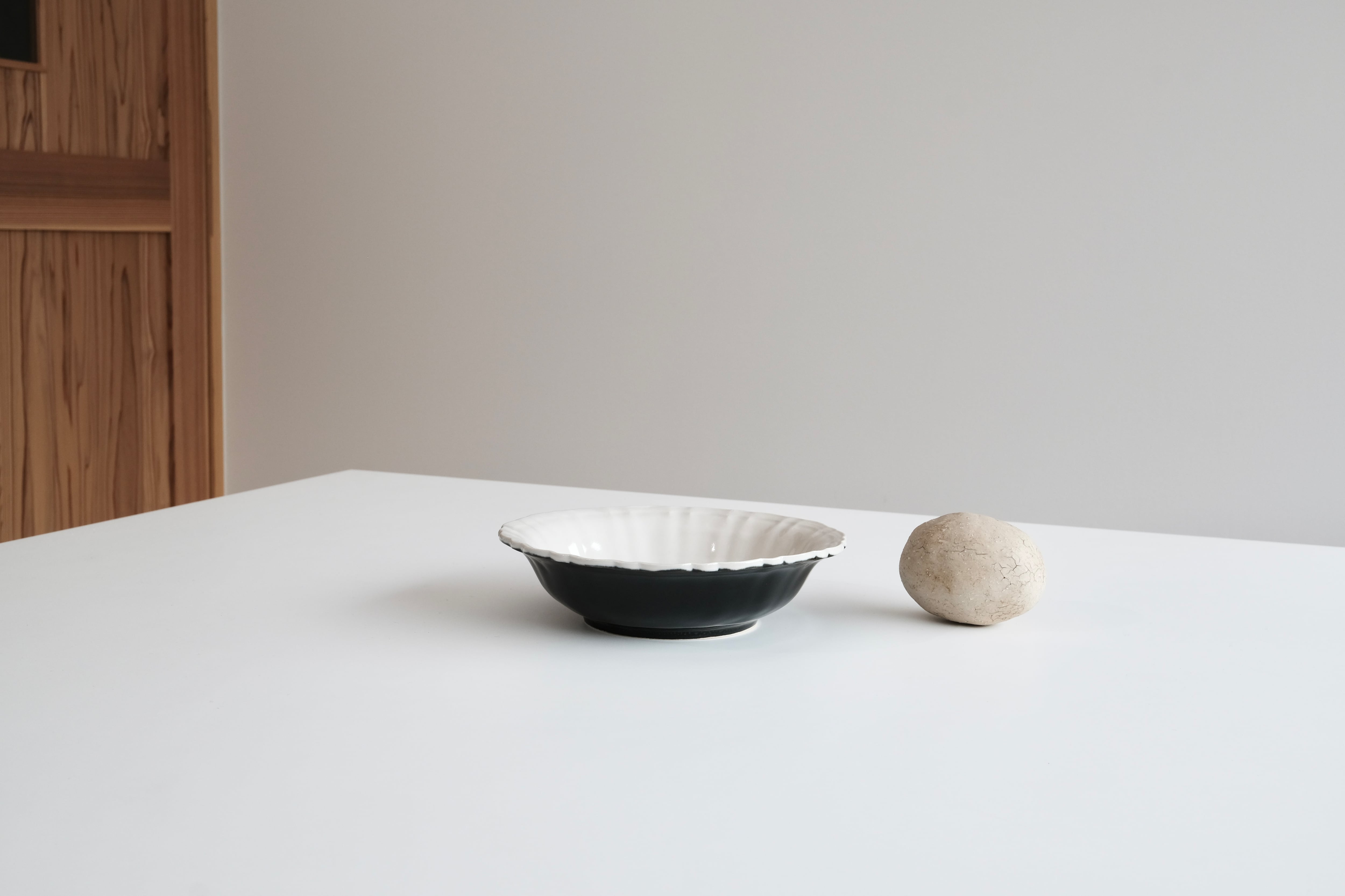 見込み部分(表面)に白、皿裏(裏面)に黒釉をそれぞれ使用し、フランス北西部の街で誕生したキュノワール(cul noir)というスタイルに。キュ=お尻、ノワール=黒という意を合わせて黒いお尻という愛称がその名の由来。