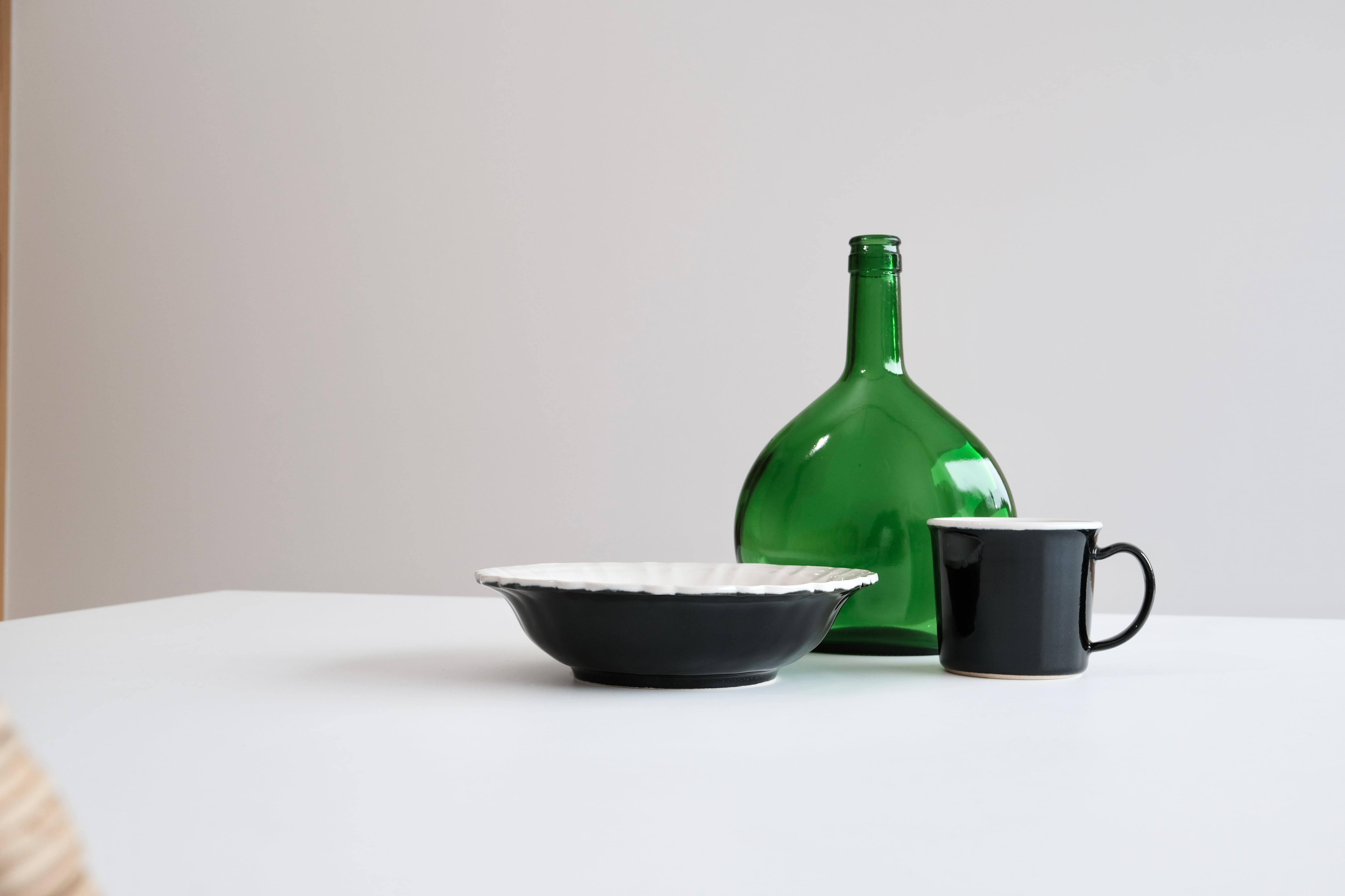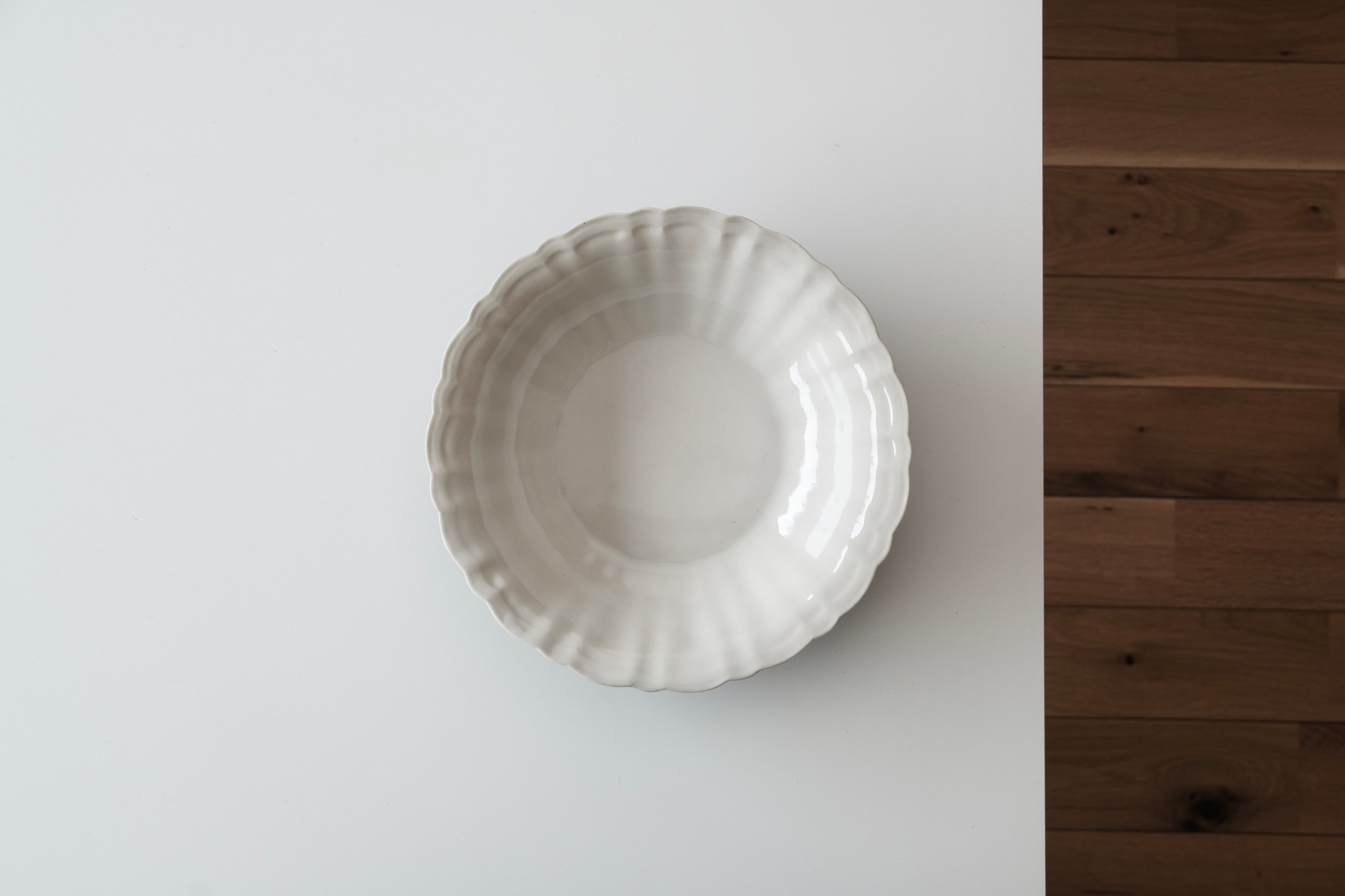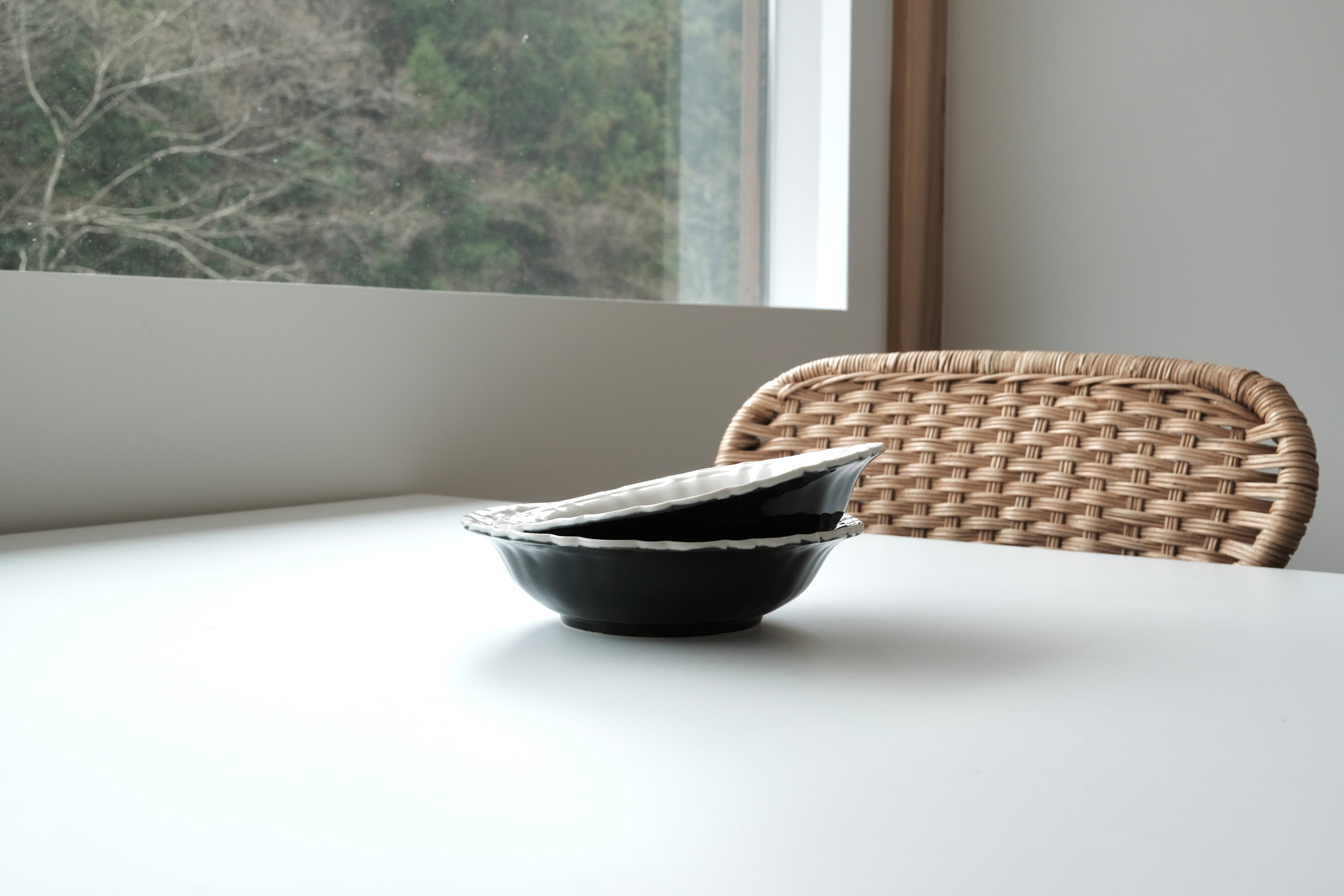 見込み部分(表面)に白、皿裏(裏面)に黒釉をそれぞれ使用し、フランス北西部の街で誕生したキュノワール(cul noir)というスタイルに。キュ=お尻、ノワール=黒という意を合わせて黒いお尻という愛称がその名の由来。